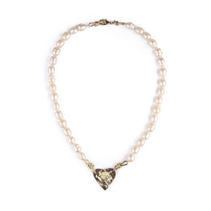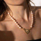 Sublime création à l’allure intemporelle et féminine, ce collier associe la douceur des perles d’eau douce baroques à l’éclat du coeur doré fusionné à la main et doré à l’or 18K.