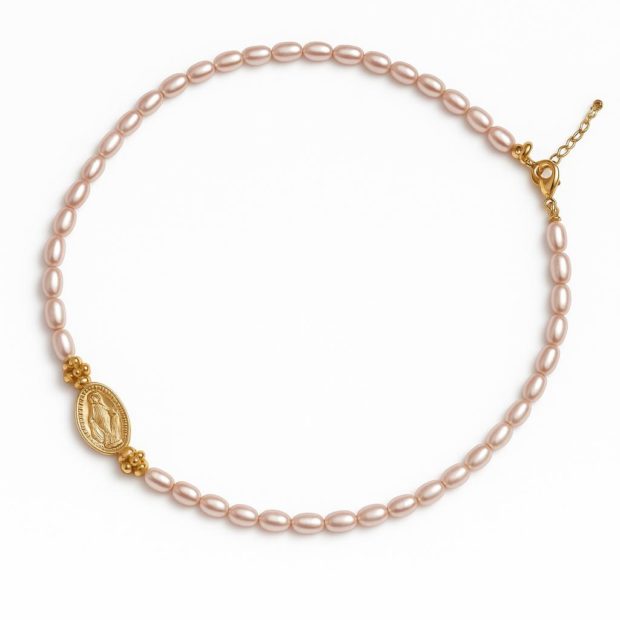 Au centre, une médaille Madone Miraculeuse finement dorée à l’or 18K, symbole de protection, d’amour et de lumière. Sa finition texturée et ses détails délicats en font un bijou chargé d’histoire et de sens.