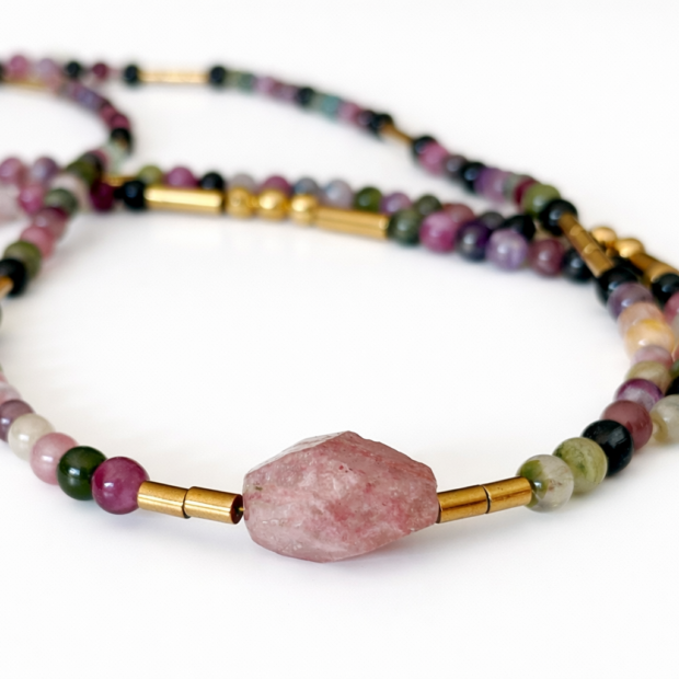 Les pierres naturelles comme la Tourmaline melon et le Quartz rose sont délicates et méritent une attention particulière. Évitez tout contact avec l’eau, les parfums, les crèmes ou les produits chimiques qui pourraient altérer leur éclat.